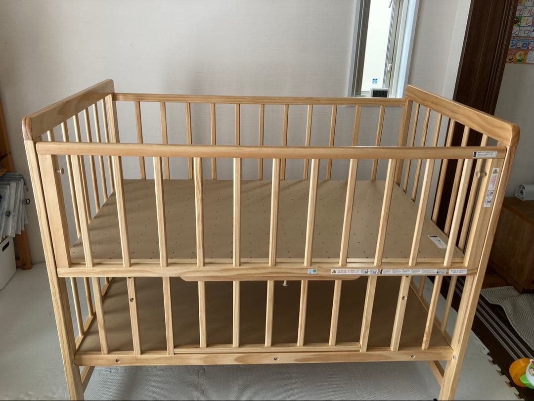 ミニタチベッド(1台)【カトージ(KATOJI)】●色:ミルキーグレー●使用対象年齢:新生児から生後24ヶ月以内●内寸60×90なのでミニ布団サイズがぴったり。●床板3段階調節可能(上55.5、中47.5、下23.5)●スライド扉式●収納扉付き●組み立て説明書付き本体サイズ• N J:W67 D94.5 H100cm• M:W60 D90cm2〜3ヶ月程リビングでのみ使用しました。夜は別のベットで寝てました。目立った大きな傷はありませんが、収納部分や角に多少の塗料剥がれ等あります。細かな傷などあるかもしれませんが、素人検品なのでご了承ください。下の段に収納があり便利です。※大きな品なので、発送にお時間をいただく場合があります。種別···ベビーベッド